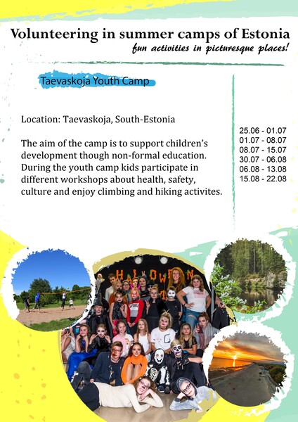 背景:Taevaskoja Youth Campは、25年前から活動している冒険的なハイキング・キャンプ。目的は、ノンフォーマル教育を通じて子どもたちの成長をサポートすること。子どもたちは、健康、安全、文化に関するさまざまなワークショップに参加し、登山やハイキングのアクティビティを楽しむ。美しい森に囲まれ、エストニアで最も長い川のひとつであるSuur Taevaskodaのすぐ近くにあります。子どもたちに手つかずの自然を身近に感じさせ、この地域に豊富に存在するエストニアの国家遺産に触れる絶好の機会を与えてくれる。子どもたちが異文化についての知識を深め、寛容な心を育むことも目的。Taevaskojaキャンプには、エストニア全土から子どもたちが集まってくる。彼らのほとんどは英語の基本的な知識を持っており、英語を練習する機会があることをとても喜んでいる。