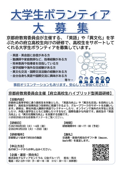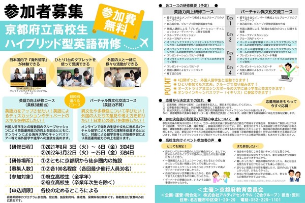 画像が小さいときは⇒ http://altiacentral.sgp1.digitaloceanspaces.com/kyoto/京都府ハイブリッド型英語研修チラシ_大学生用_210622.pdf イベント紹介⇒ http://altiacentral.sgp1.digitaloceanspaces.com/kyoto/京都府ハイブリッド型英語研修チラシ_高校生用_210622.jpg