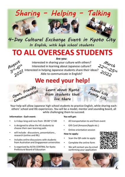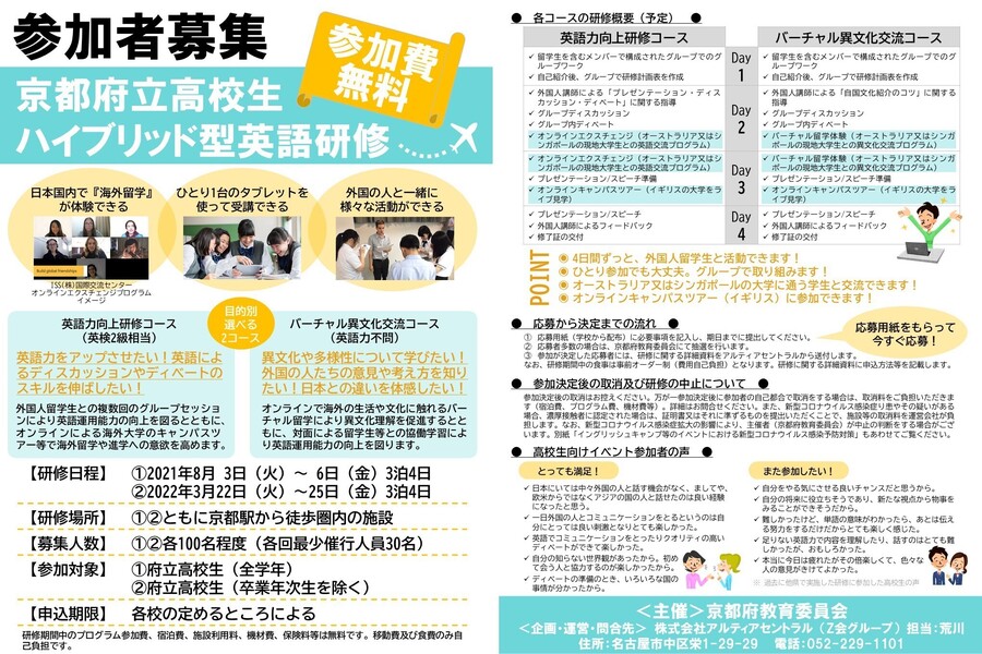 画像が小さいときは⇒ http://altiacentral.sgp1.digitaloceanspaces.com/kyoto/京都府ハイブリッド型英語研修チラシ_留学生用_210622.pdf イベント紹介⇒ http://altiacentral.sgp1.digitaloceanspaces.com/kyoto/京都府ハイブリッド型英語研修チラシ_高校生用_210622.jpg