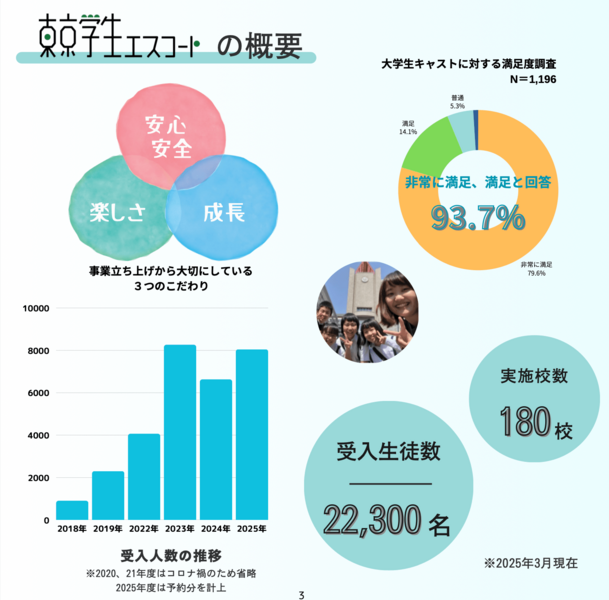 地方から東京に修学旅行に来る中学生5~8人につき首都圏在住の大学生が一人ずつ担当し、都内の観光名所をエスコートしながら「感動と学び」に溢れる最高の修学旅行を作り出します。