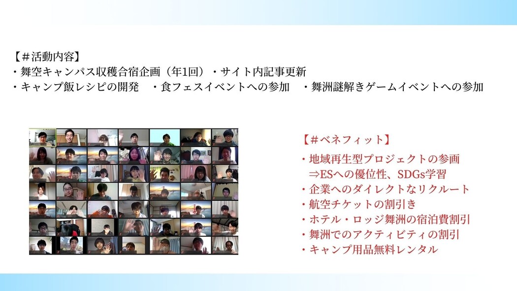 勉強が出来ます。舞洲を拠点に全国の学生と繋がることが出来て、輪が広がります。