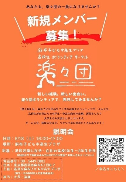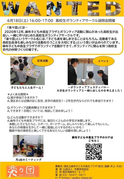 港区立麻布子ども中高生プラザは、港区にある幼児から高校生世代までを対象とした児童館です。毎月様々なプログラムを運営しています。今回は、高校生ボランティアサークル「楽々団」の説明会開催のお知らせです。