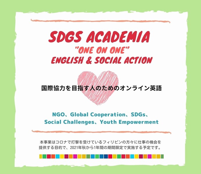 【大学生向け、海外NGOでのインターン制度】 国際協力を目指す人向けの、SDGs理解と英語上達に特化したプログラムを開発します!SDGsを英語で学ぶ、10時間の英語メンタリング付き。