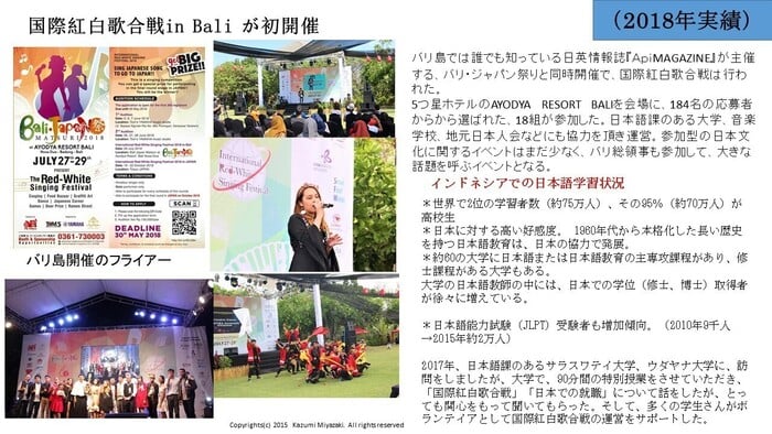 インドネシア・バリ島(2018)バリJAPAN祭りとの共催で、行いました。多くのインドネシアの大学生がボランテイアとして、出演者として参加してくれました。