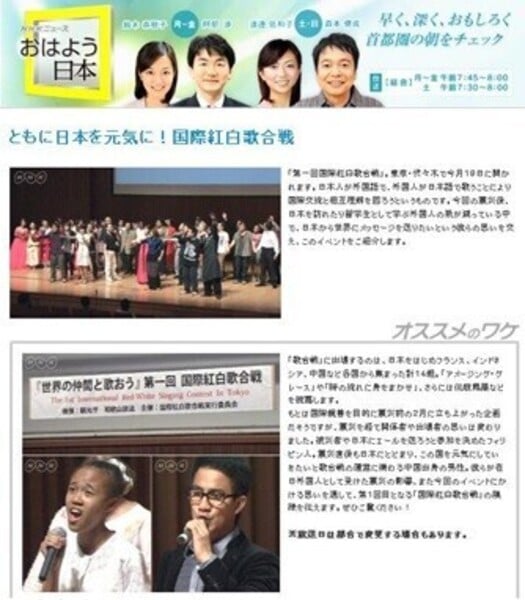 国際紅白歌合戦は、『外国人は日本語で、日本人は外国語で歌う歌の国際交流』として、外務省、観光庁なども毎年後援するイベントとしてNHKなど多くのメディアでも毎年取り上げられています。