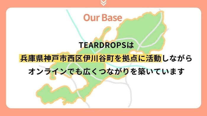 TEARDROPSは、「NPO法人化&神戸市西区伊川谷町での居場所支援」を目標に2021年1月に「生きることの、楽しさも、辛さも、共有したい」をテーマに掲げ任意団体として設立。Twitterを中心に全国からメンバーを集め、現在大学生・高校生・社会人含め30名(2025年11月現在)が所属する団体となりました。