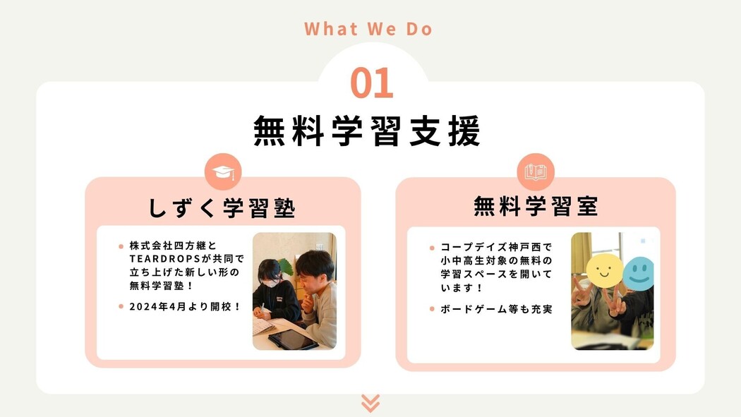 しずく学習塾は、兵庫県神戸市西区伊川谷町で、「勉強につまづいている」「経済的に塾に通うことが難しい」「身近に学校や家庭のことを相談できる相手がいない」といった悩みを抱えている公立中学校に通う中学生を対象に、毎週水曜日17:30-19:00、無料で学習支援を行っています。伊川谷で若者の居場所づくりを目指すTEARDROPSと、地元で建築会社として20年以上の実績がある株式会社四方継が相互協力して立ち上げた、新しい形の無料学習塾です!