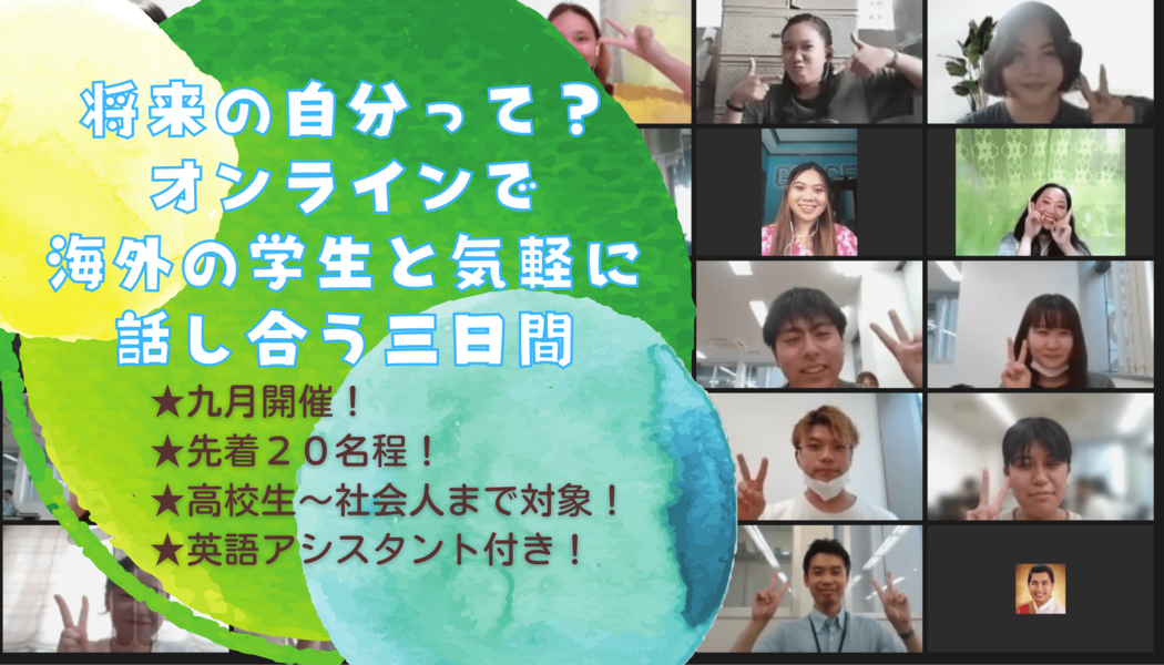 英語アシスタント付きのオンラインイベントで海外の学生達と気軽に話し合い、考え方を知り、自分の将来を考えてみませんか?