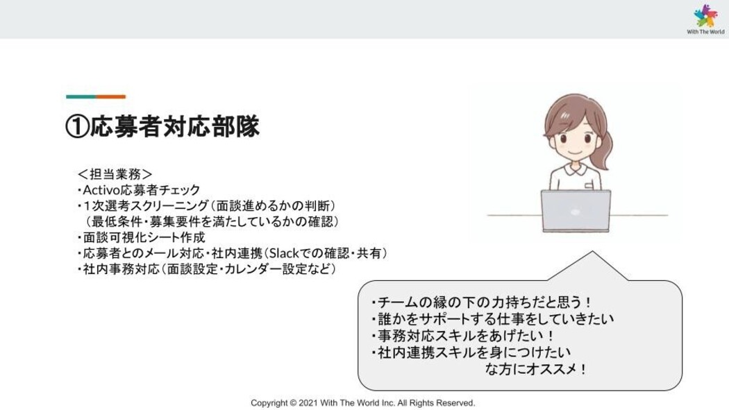・毎週のミーティングに加えてすき間時間を活用して活動していただける方