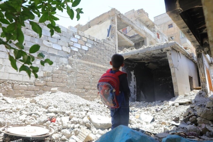 爆撃によって破壊された校舎のがれきの上に立つ、新一年生のイサさん(7歳、シリア)