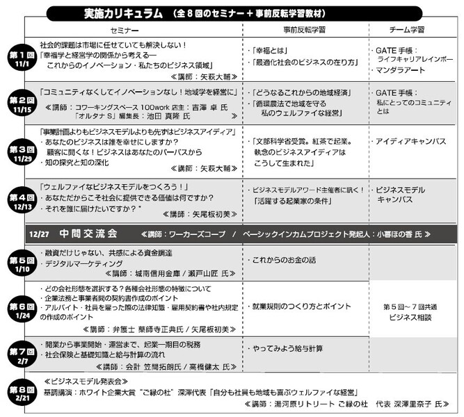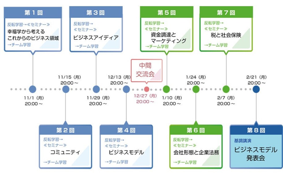第8回最終回は、一堂に会して、特別講師をお招きしてのゲスト講演、そして、ウェルファイなビジネスモデル発表会を行います。 起業家コースは「ビジネスモデル」を発表頂きます。