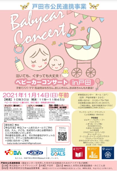 今年は「戸田市公民連携事業(福祉センターを利用した多世代交流推進のためのアイデア及び連携)」として、午前は「ベビーカーコンサートin戸田」、午後は「こども絆コンサートin戸田」を開催されます。
