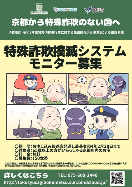 京都府在住の65歳以上の方のモニターボランティア募集。特殊詐欺防御を目的としたシステムを固定電話につなげるだけ。特殊詐欺撲滅にご協力いただけませんか?