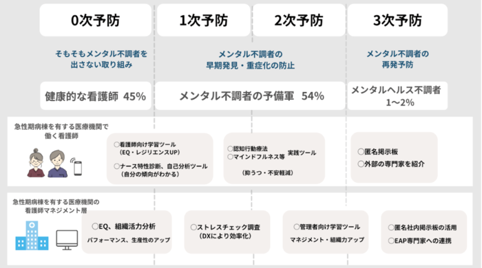病棟特化のストレスチェック、組織活力分析、外部カウンセリングサービス、管理者向け学習ツールを提供