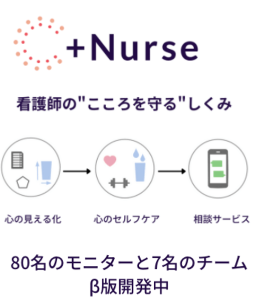 "こころ"のスコアリング、トレーニング、また外部専門家への相談サービスを主要機能とし、80名の現役ナースと開発中。
