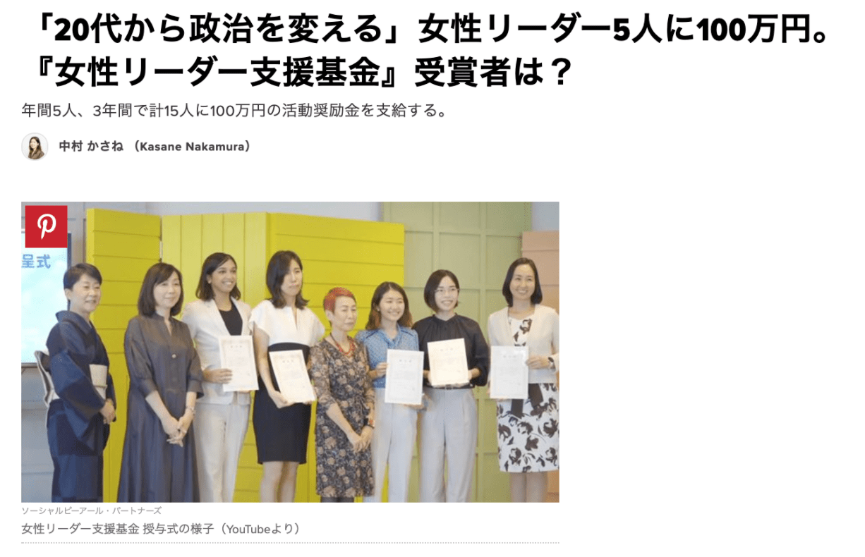 代表Wim.が「女性リーダー支援基金 ~一粒の麦~」の5名に選定