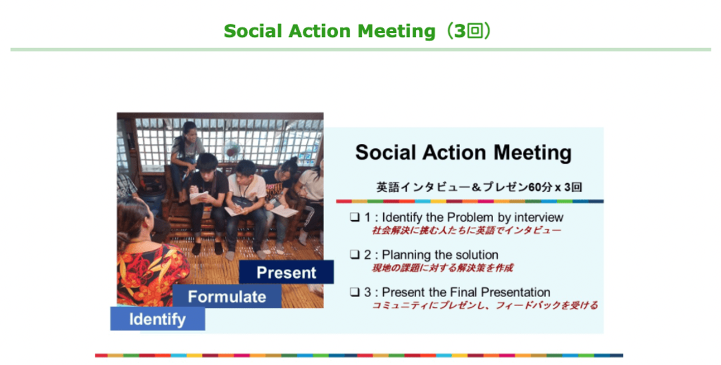 Social Actionの時間では、貧困コミュニティで活動する方にインタビューし、受講者自らアクション案を形成し、効果的なインタビューやプレゼン力を習得します。アクション案が見事コミュニティに選ばれると実際の活動が実現します。