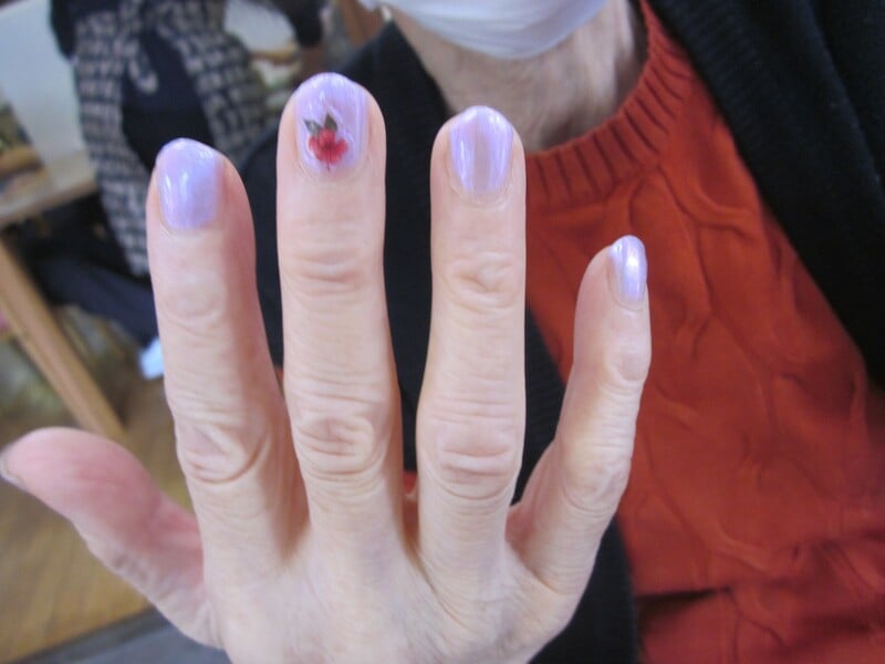 新聞掲載でガンチーを知って、亡くなった祖母にお化粧をして喜んでもらっていたことを思い出し、介護美容に興味があったこともあり、メールで問合せをしました。月1~2回程度、午後から2時間ほど参加しています。ネイリストの資格はないので、利用者の方とお話をしながらネイル後のドライ、広報用写真の撮影などをしています。