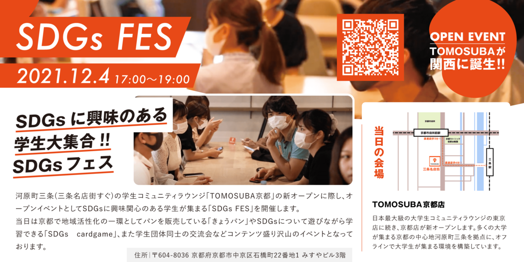河原町三条(三条名店街すぐ)の学生コミュニティラウンジ 「TOMOSUBA京都」 の新オープンに際し、 オープニングイベントとして、 SDGSに興味関心のある学生が集まる 「SDGs FES」 を開催します。