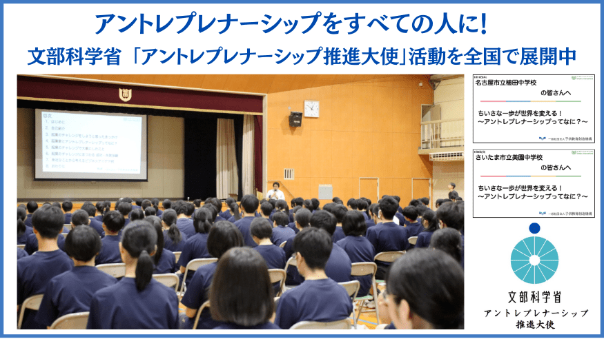 文部科学省「アントレプレナーシップ推進大使」として、2025年9月にさいたま市立美園中学校、名古屋市立植田中学校、長崎県新上五島町立有川中学校の3校にて、アントレプレナーシップ教育の出前授業を実施いたしました。