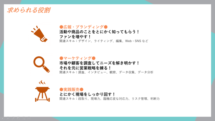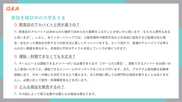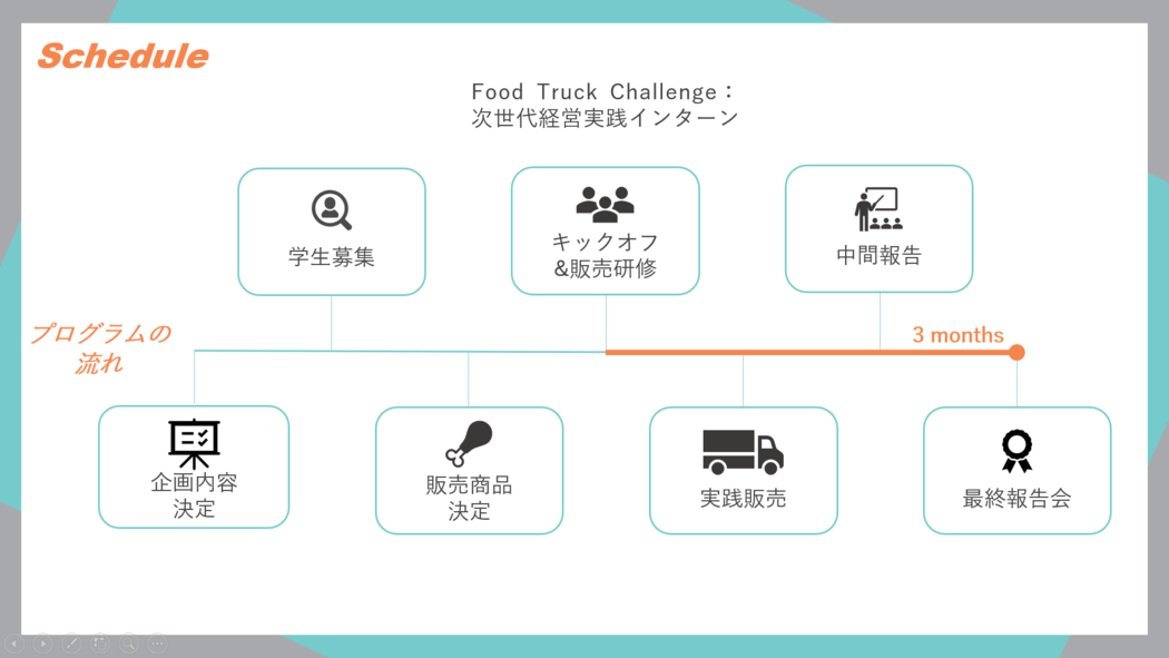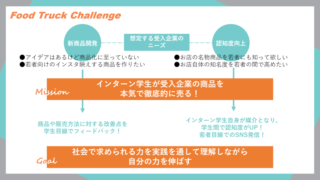 キッチンカーだからこそできるシンプルなゴール設計となっているインターンプログラム。とにかく実践経験を積んで経営スキルを身に付けよう!
