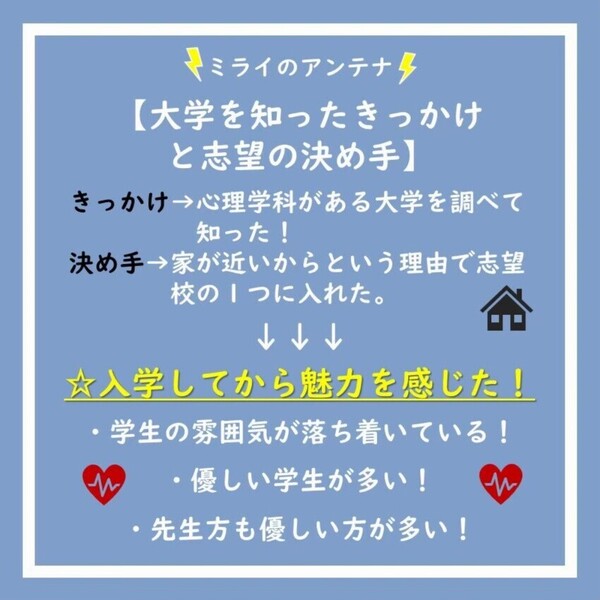 私が僕ミラに関わったのは、1歩踏み出せない人に背中を押せる手助けをしたいと思ったのがきっかけです。自分の高校時代は自己肯定感が低く何もかもに自信がありませんでした。それを踏まえ、将来を決断をする上でそのお手伝いが出来ればと思い、参加しました。
