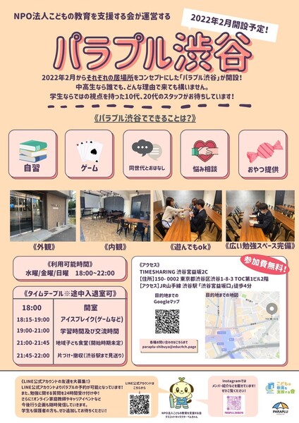 ”それぞれの居場所”をテーマに、2022年2月にパラプル渋谷を開設します。中高生と一緒にゲームや勉強をしませんか?ボランティアスタッフは全員大学生です!