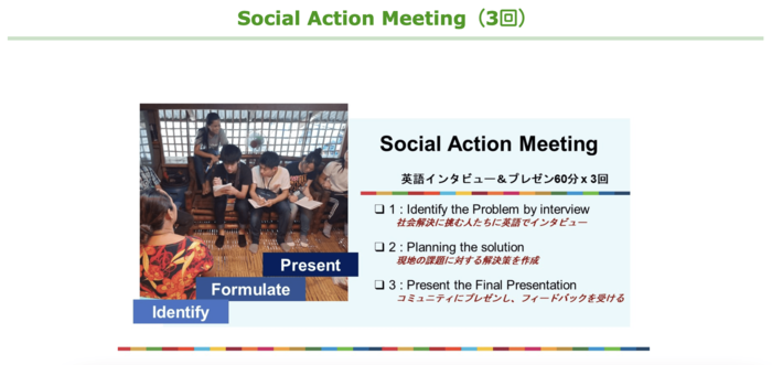 Social Actionの時間では、貧困コミュニティで活動する方にインタビューし、受講者自らアクション案を形成し、効果的なインタビューやプレゼン力を習得します。アクション案が見事コミュニティに選ばれると実際の活動が実現します。