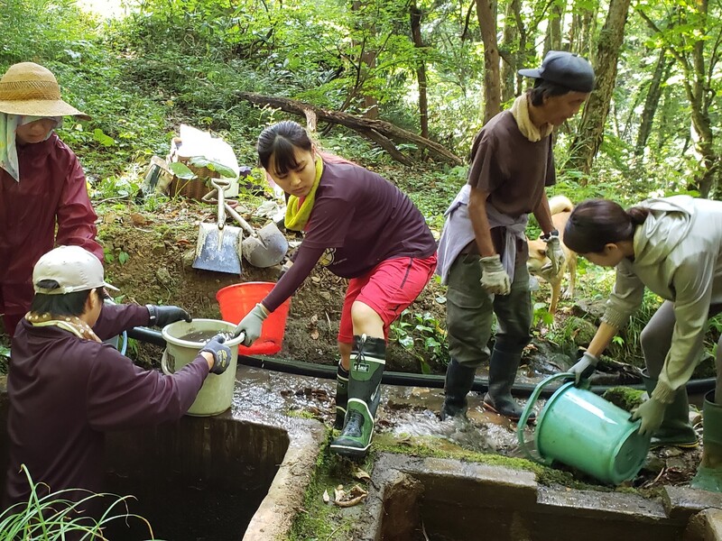 共働学舎・真木農場と2000年から毎年共催。共働学舎は1974年設立。競争社会から協力社会への転換を目指し、農業を学びたい人、知的障がい者、引きこもり等、様々な人々・約120名が北海道・長野・東京の共同体で、有機農業や畜産に取り組む。かつては100名程が住んだ標高900mの真木集落は、町への交通手段が急な山道の徒歩(4km)しかなく、1970年代に廃村になった。その後共働学舎の人達が住み込み、数名が有機農業や屋根の萱葺きに取り組む。近年は水車小屋での製材、養蜂、古民家再生にも挑戦中。不便であることを逆手に取り、保育・看護学生の実習、子ども合宿、NICEから中長期ボランティア等も受け入れてきた。ワークキャンプは作業を手伝い、生活を共有して新鮮な「外からの風」としての役割を発揮。