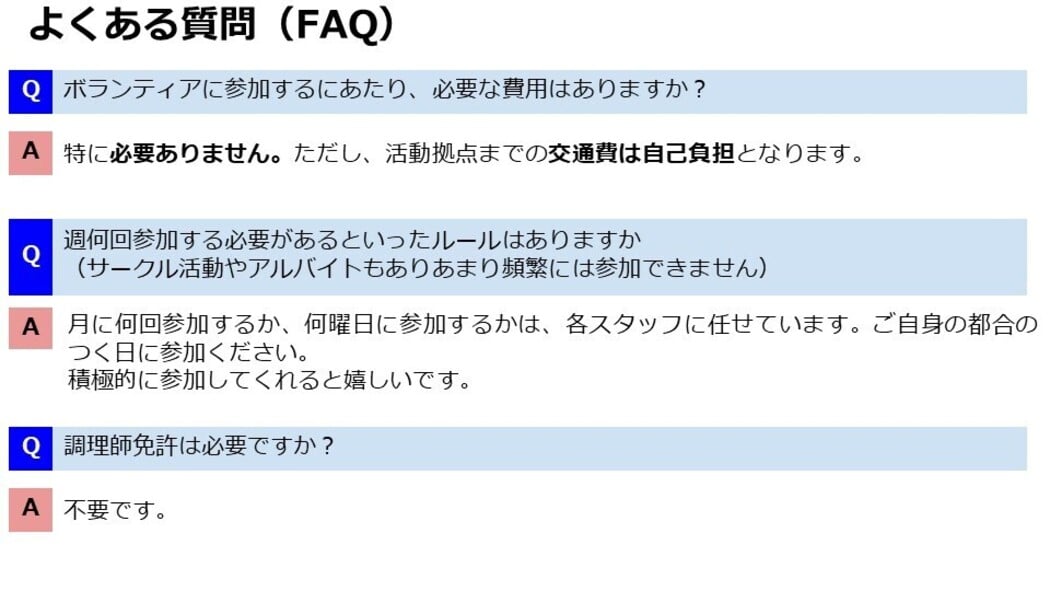 期間は相談可 ※週1回、隔週、月1回、不定期なども可能ですが、慣れていただき、自主的な運営ができるように、長期的に参加することのできる方を歓迎します。 |