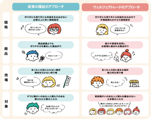 - この取り組みを「ウェルフェアトレード」(Welfare+Fairtrade)とよび、障害者の収入や働き甲斐を高めると同時に、社会の障害者理解の促進につなげています。