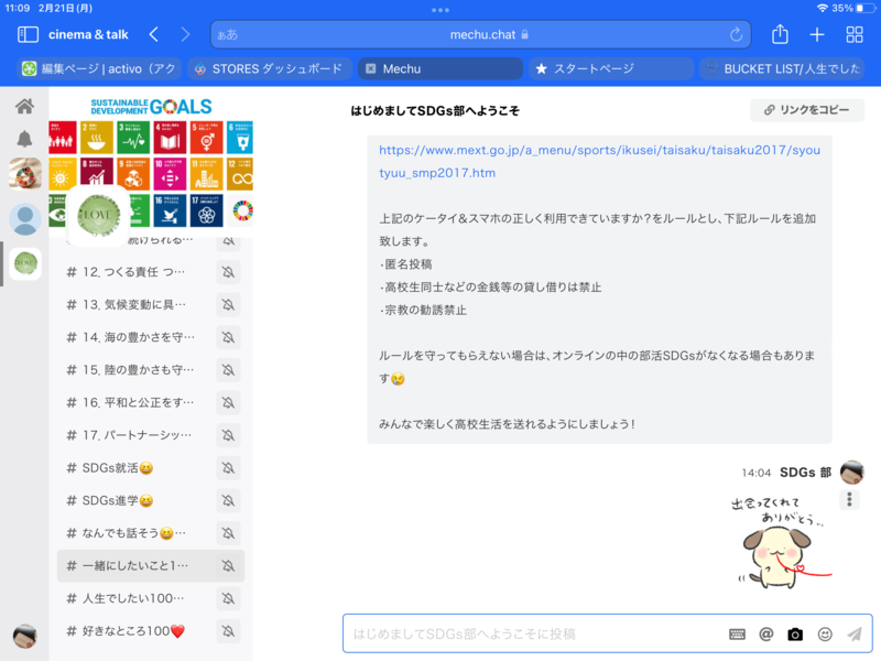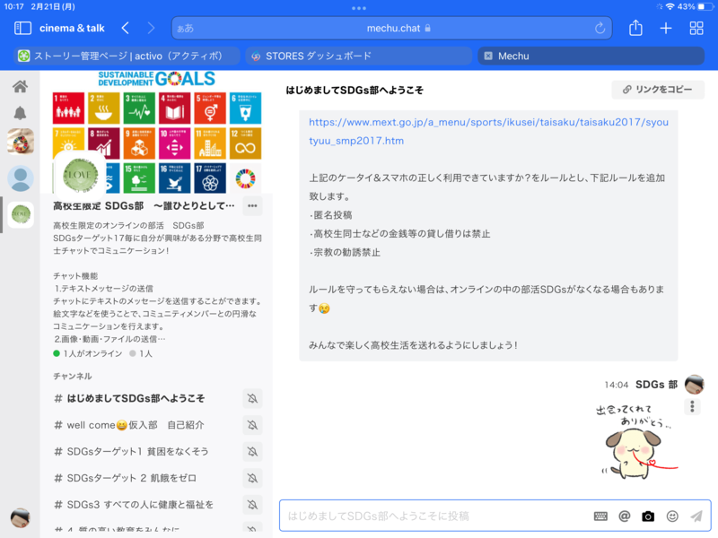 SDGs部のオンラインの部室はこんな感じです。(専用のアプリをダウンロード後)