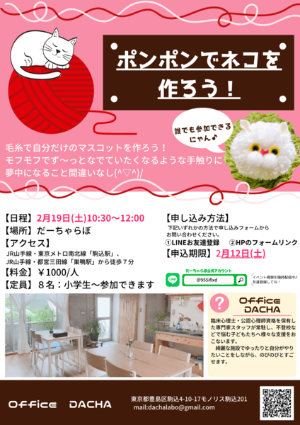 「フリースクールだーちゃ」を運営するNPO法人だーちゃらぼが主催するイベントの単発ボランティアを募集します。【ポンポンでネコを作ろう】2月19日(土)10:30~12:00フリースクールだーちゃ内にて