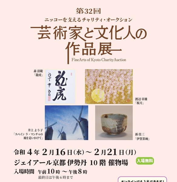 第32回チャリティーオークション「芸術家と文化人の作品展」は、茶道三千家の家元や、関西を中心に活動されている日本画家、洋画家、陶芸家、そして関西の代表的な寺院の宗教家の方々よりご寄贈いただいた芸術作品、及び芸能関係者などから寄贈いただいた作品の展示・入札会です。この収益は、必要経費を除きすべて、本イベントを後援する公益社団法人 日本国際民間協力会(NICCO)に寄付され、アフガニスタン緊急人道支援、ヨルダンの青少年更生施設支援、インドでの農村支援などに活用されます。