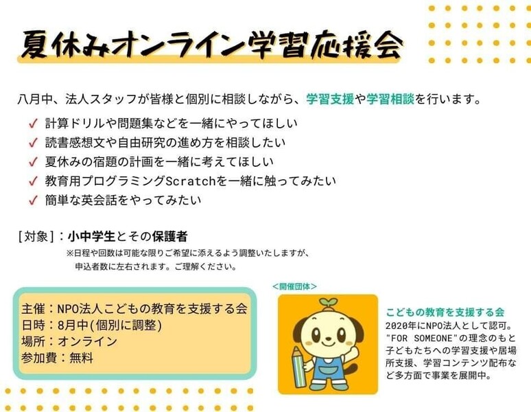 この募集の受入法人「NPO法人こどもの教育を支援する会」をフォローして、