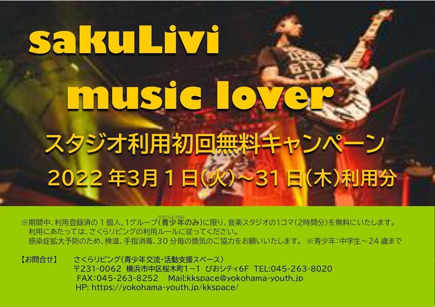 2022年3月1日(火)~31日(木)の間。青少年個人、団体に限り、音楽スタジオの利用料が1回無料!!