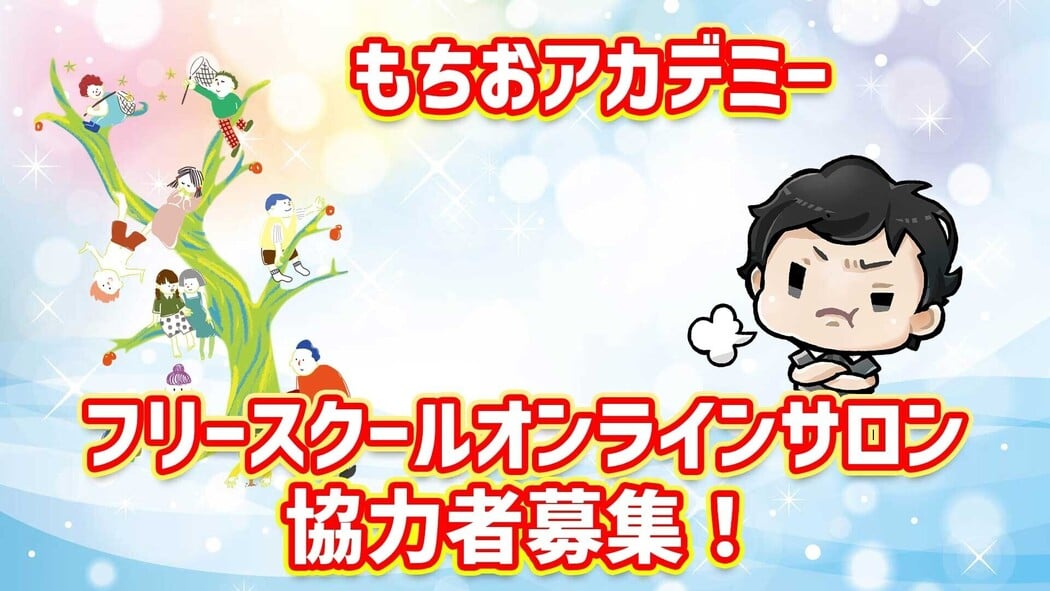 フリースクールもちおアカデミー主催のオンラインサロンです。オンラインからはじめ日本中でオフラインでのイベントを行うことで不登校の子供と学校に行く子の分断をなくし大人も子供も楽しめる世の中を作りませんか