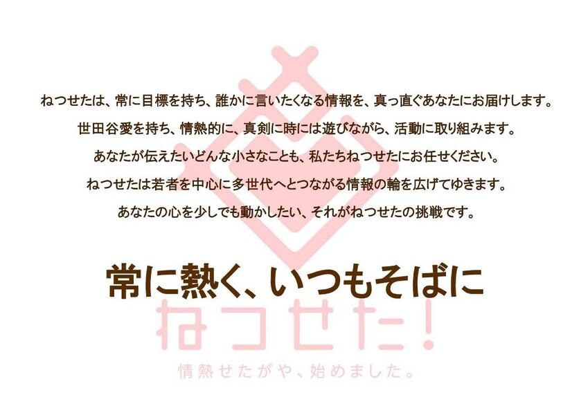 これは、「ねつせた!」が世田谷区の情熱を持った若者が輝ける場所になるよう、1期メンバーが考えたスローガン