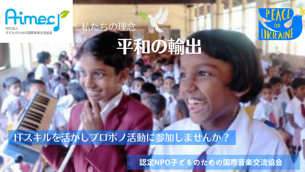 当団体活動は一昨年神奈川県より認定を受け活動が拡大しつつあるところです。当団体の組織運営において、団体の認知向上、会員数、寄付金増強、楽器寄贈者拡大といったことがあり、これら課題に対してサイトやSNSを通じた広報活動の強化が求められております。こういった領域で一緒に国際的な社会貢献活動に参加しながら広報、マーケティングにかかわるスキルアップにチャレンジしたいという若い力がボランティアとして参加してくれました。これら高校生、大学生を技術的にサポートしていくことが可能なプロボノを募集しております。WPもしくはWix制作スキルやデザイン、動画制作、編集など得意分野に限っての参加も歓迎です。プロボノチームを作ってみんなで学生ボランティアを育てながら、世界の子どもたちに平和と届ける活動を発展させていきたいと願っております。そのような活動に共感していただけるプロに是非参加して頂きたいです!!