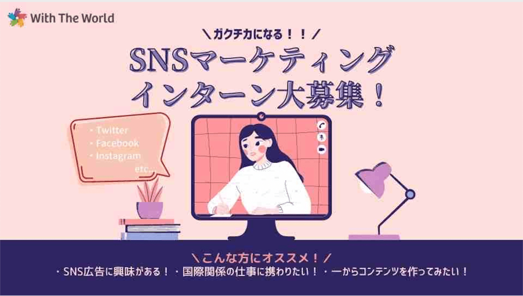 このSNSマーケティングインターンでは、With The Worldの周知や顧客の獲得、ファンの獲得を目指して、チームで広報活動を行っていきます!