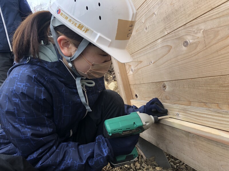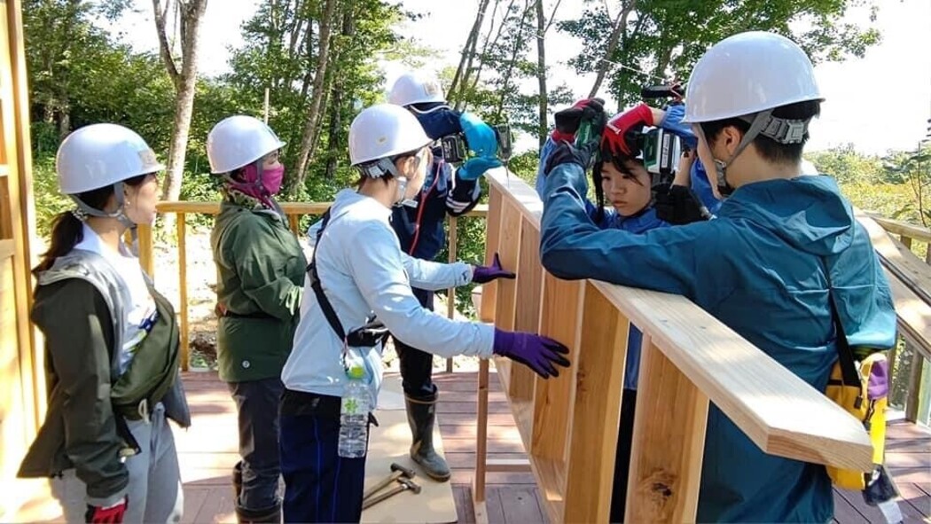 では、震災前までは人と人との繋がりが強かったのですが、震災後の集団移転によりその繋がりがほとんどなくなってしまいました。そのため、その地域から笑顔と元気が少なくなっていってしまったのです。そんな中、一人の男性が、誰もが気軽に来れて、「ここに来たら元気になれる」という居場所を作りたい、と立ち上がりました。現地の木材を使い、自然いっぱいの中でボランティア活動をします!