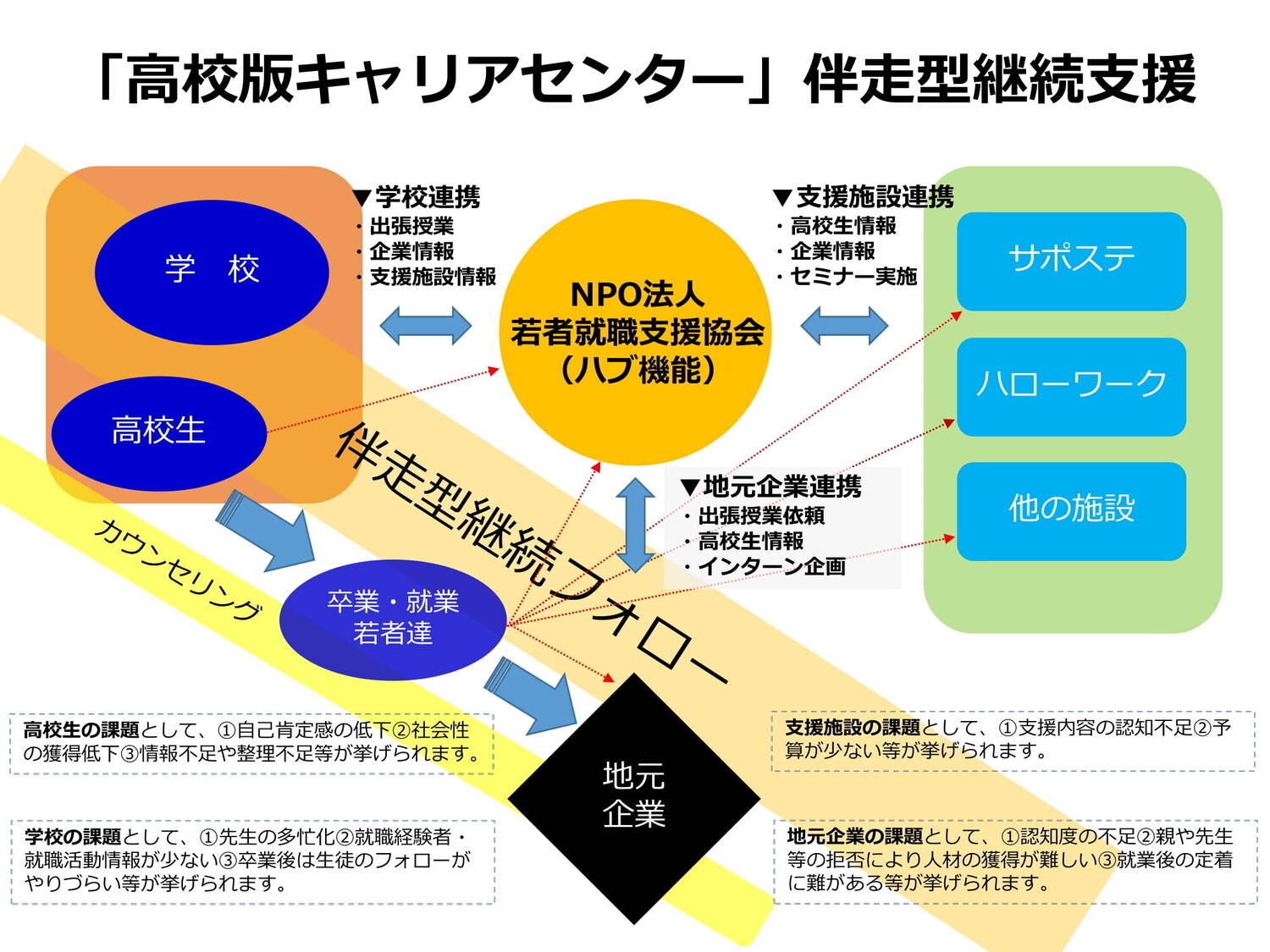 地元企業・学校・若者・支援施設を繋ぎサポートする活動です。