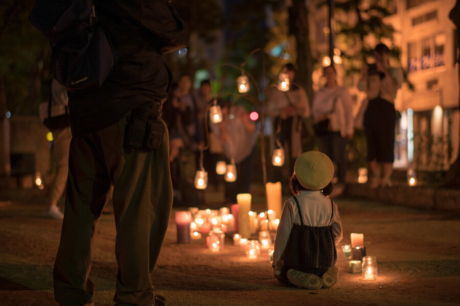 岡山市のご協力をいただき、この日だけはエリアの街灯が消え、約3,000個のキャンドルのゆらめきがあたたかく彩ります。