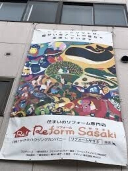 これまでに、障がい者アート協会と協調して建築現場の現場シートに障がい者アーティストの絵を飾る