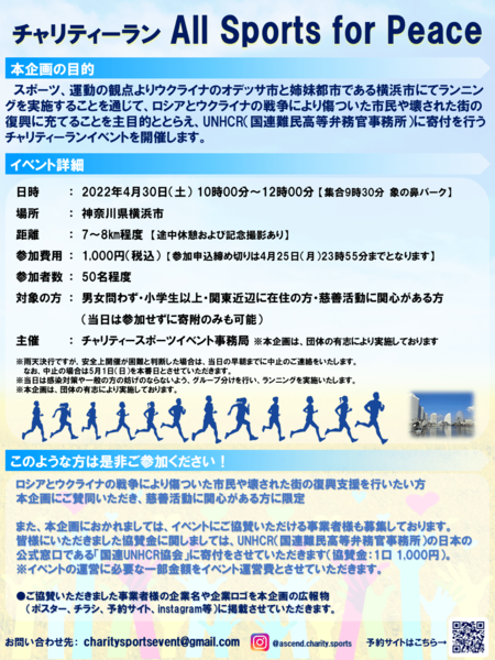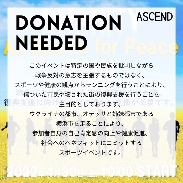 本イベントはスポーツや健康の観点よりウクライナのオデッサ市と姉妹都市である横浜市にてランニングを実施することを通じて、ロシアとウクライナの戦争により、傷ついた市民や壊された街の復興に充てることを主目的ととらえ、UNHCRに寄付を行うことを目的とする、「チャリティーラン All Sports for Peace」を開催します。