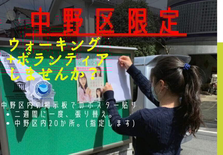 東京都中野区内でポスターを掲示板に貼って頂くボランティア。 NPO法人維新隊ユネスコクラブが運営を行う食事つき無料自習室のA4チラシを、新江古田から半径約2km以内の掲示板に、月に1度貼って下さい。