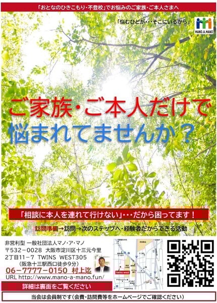 ひきこもりや不登校でお悩みの方、ご家族様へ。経験者としての視点から、個別のご相談を伺わせて頂きます。当会のホームページもご覧ください。