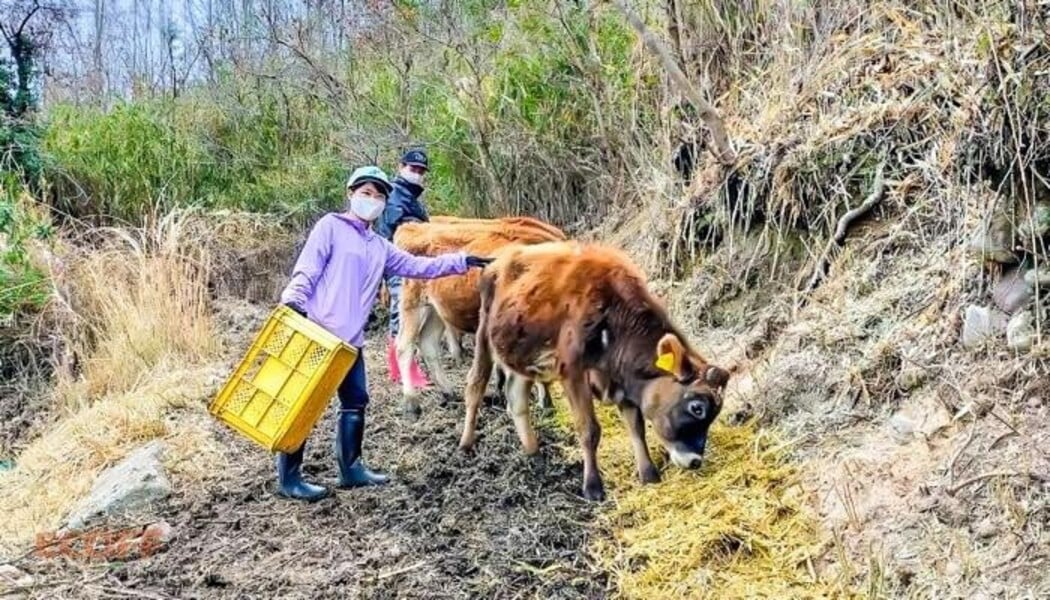 ・牛たちの確認 牧場の牛たちを集めます。1頭1頭名前を呼んで飼料を与えながら、体調など確認していきます。竹山で牛を探したり、飼料を運んだりするだけで結構疲れます。