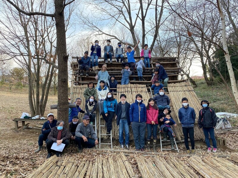 自然の循環を活かしながら緑地を訪ねる人達の休憩場所として使われる、茅葺き小屋の屋根を完成させます。屋根は約4年間・14回の週末ワークキャンプで茅刈りと茅葺きを続け、あとは頂上部だけになりました!他の緑地保全活動(水路の修復、歩道や階段の補修、竹の間伐など)も行う可能性があります。
