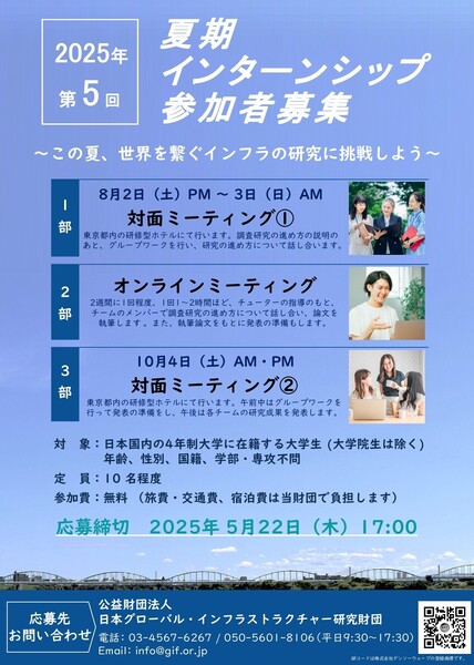 大学生を対象に、調査研究の手法や論文執筆を体験していただく夏期インターンシップを開催いたします。グローバルインフラに関する調査研究の方法を学び、結果を論文に取りまとめる経験に挑戦しましょう。